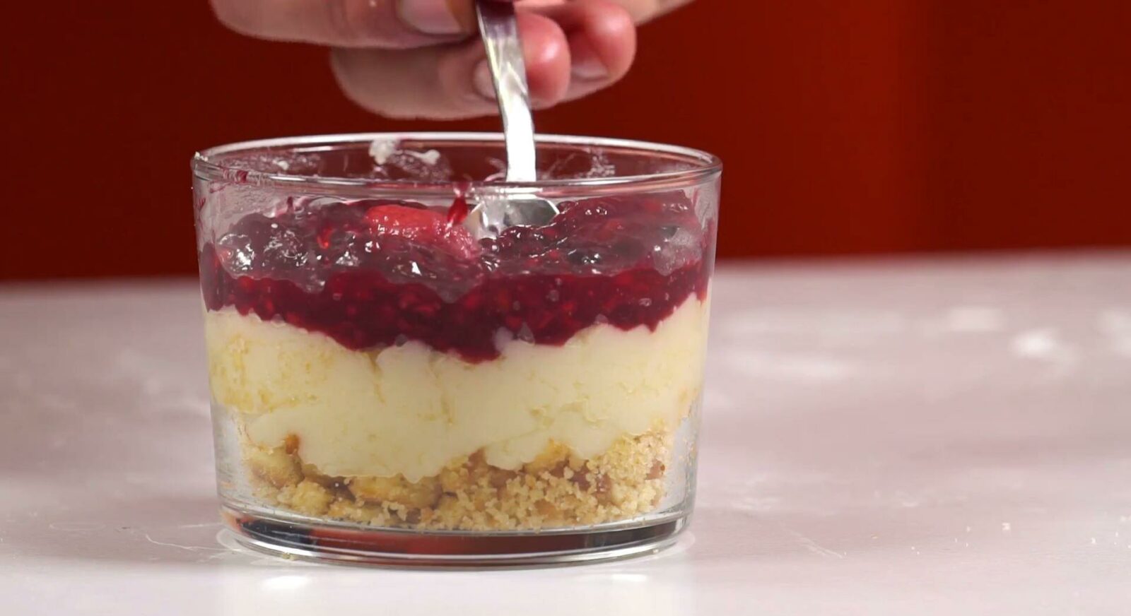 Bir kupun içine ilk olarak tereyağında kavurduğunuz bebe bisküvisini ekleyin. Üstüne kremayı yerleştirip en üste de böğürtlenli sosu ekledikten sonra afiyetle yiyin.