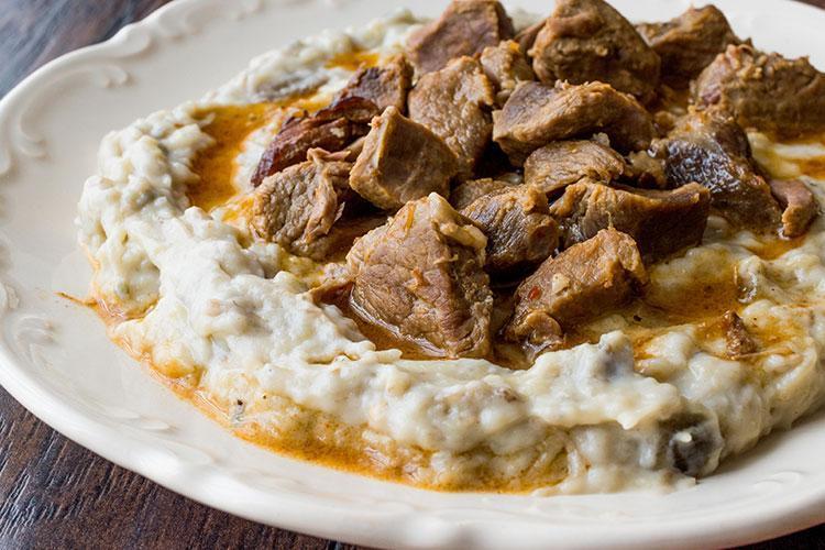 Servis ederken önce beğendiyi tabağa alın, üzerine etleri paylaştırın.