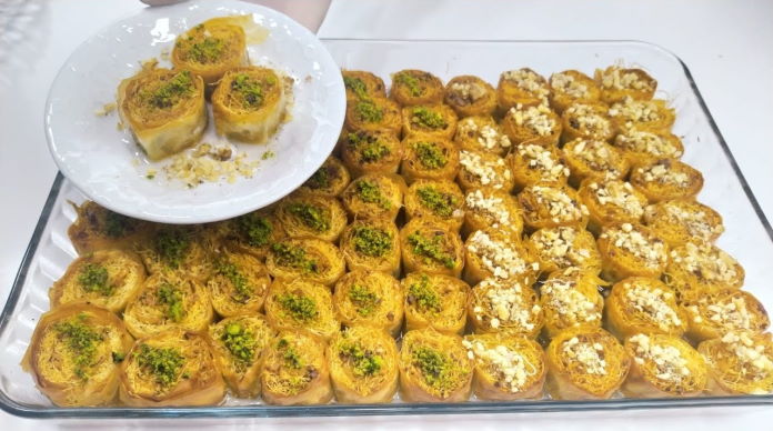 Kadayıf tatlısını seviyorsanız, size harika bir kadayıflı tatlı tarifi ile geldiğimizi hemen söyleyelim. Baklavalık hazır yufkanın arasına kadayıfımızı sarıp fırınlamamız yeterli. İnanın çok kolay yapılıyor. Tarifte antep fıstığı ve fındık kullanılmış ama ben bu tatlıyı cevizli daha çok seviyorum. Sizde evde hangisi varsa, canınız hangisini istiyorsa gönül rahatlığıyla kullanabilirsiniz. Kadayıflı tatlı malzemeleri 44 – 48 adet baklavalık yufka 500 gr ...