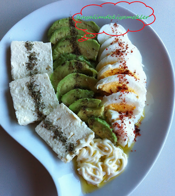 - avokadoyo kasikla kabugundan ayirip dilim dilim yapin yumurtanin yanina dizin ustune karabiber serpin