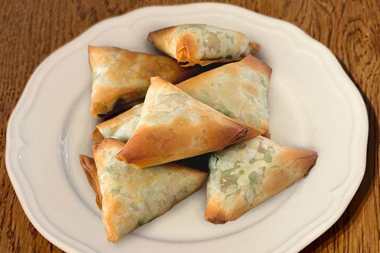 Şerit yufkalarınıza sebzeli harcı eşit dağıtarak, muska şeklinde ucundan üçgen katlamaya başlayarak şekil verin.