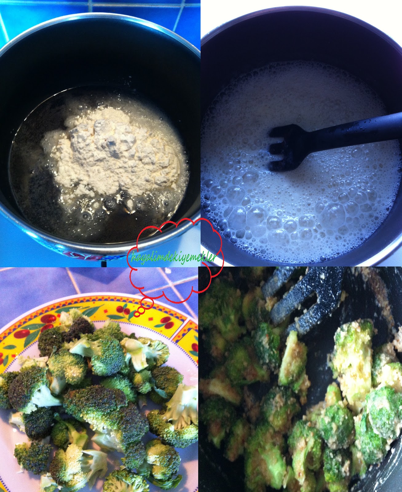 kavurdugunuz unun uzerine yikayip ayiklamis oldugunuz brokoliyi koyup 1 dakikada brokoliyle kavurup kaynamis olan suyu ve tavuk bulyonu ilave edip kaynatin