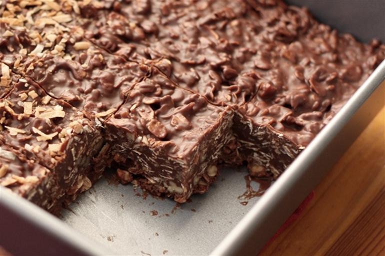 Kuru kayısıları küp küp doğrayın ve her malzemeyi mutfak robotunda çektirin. Ardından tüm malzemeleri çektirin. Karışımı elinizde sıkıştırarak tepsinin üzerine dizin.