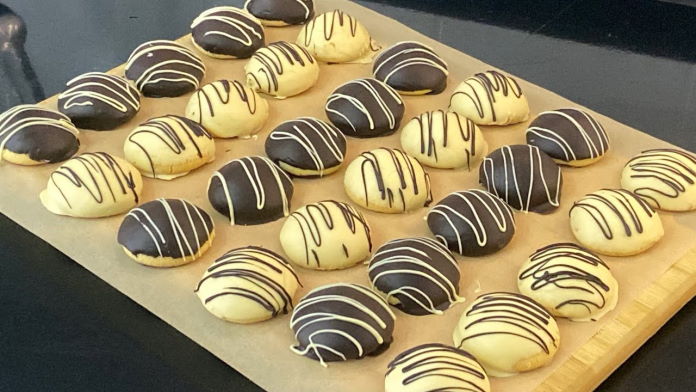 Öyle bir kurabiye yapıyoruz ki; misafirlerinizin hepsi sizin bu kurabiyeleri hazır satın aldığınızı zannedecek. Gerçekten görünüşüyle, lezzetiyle profesyonel ellerden çıkmış tarzda çikolata kaplamalı bademli kurabiyeler yapıyoruz.