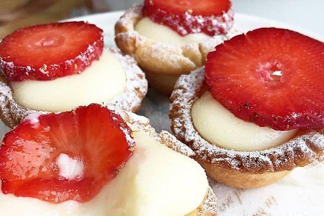 Hamurunuz pişince kreması için tüm malzemeleri ocağa alıp çırparak pişirin. Krema sıcakken tart kaplarına yerleştirin. Üzerini çilek dilimi ve pudra şekeri ile süsleyin.