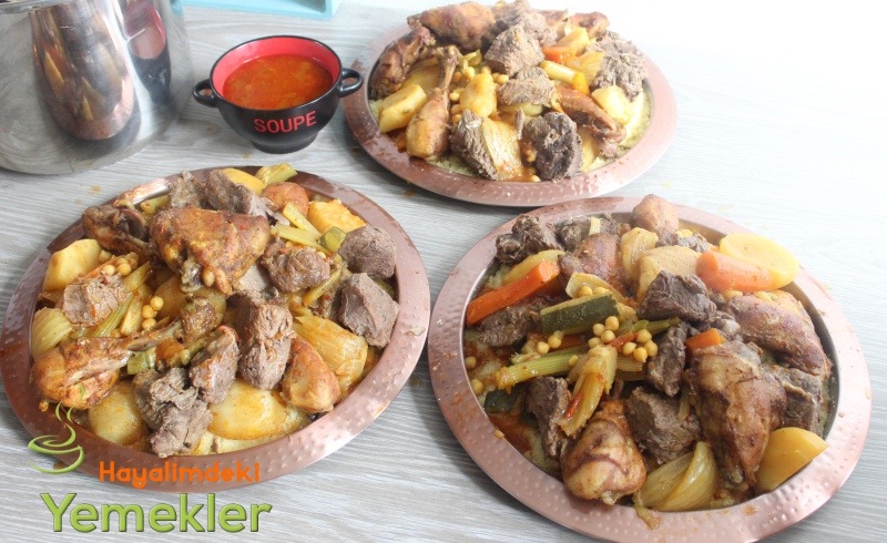 Couscous bir tepsiye alin üzerine sebze yemeginin bir kismini eti,kızaran tavuk butlarını, mergezi koyun yemeğin sosundan gezdirin en son kızarmış kuru üzümleri ilave edin ve servis yapın.