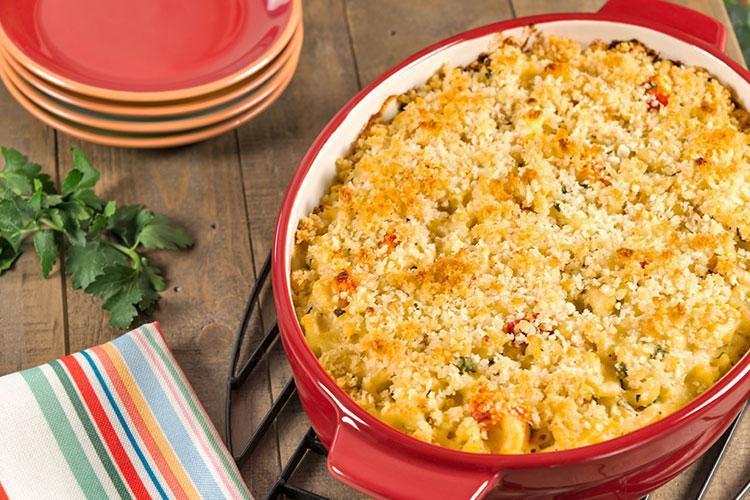Üstüne haşlanan makarnadan biraz koyun ve tekrar çökelek serpin.
