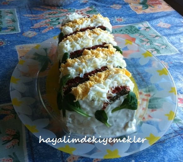 etmekli tavuk gogsu salatasinin ustune sirasiyla resimde goruldugu gibi once yumurtanin beyazi sonra pulbiber sonra nane ensonunda yumurtanin sarisini koyun sirasiyla ayni islemi pastanin uzerinde yer kalmayana kadar devam edin.kenarlarinida istediginiz yesillikle kaplayin.ben semizotu kullandim maydanoz ve dereotuda cok yakisir.buzdolabinda 3 veya 4 saat dinlendirip servis yapabilirsiniz AFIYET OLSUN