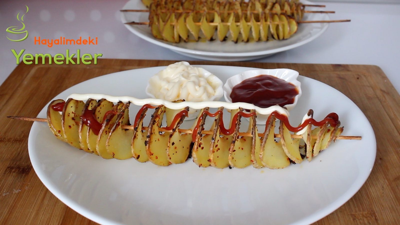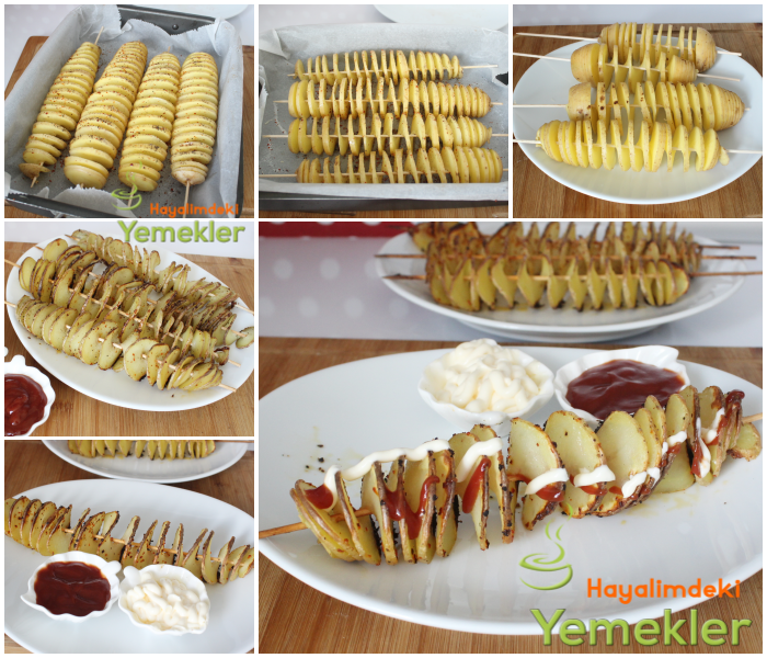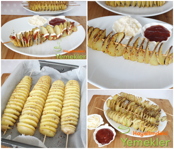- Patatesleri güzelce yıkayın uzunlamasına çöp şişlere takın baştan başlayarak verev olarak ince olacak şekilde dilimleyerek alt kısmına kadar kesin kesme aparatı varsa daha kolay yapabilirsiniz,