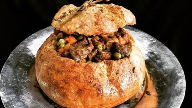 Yuvarlak tam buğday ekmeğinin üzerini kapak olacak şekilde kesin ve ekmeğin içini alın.