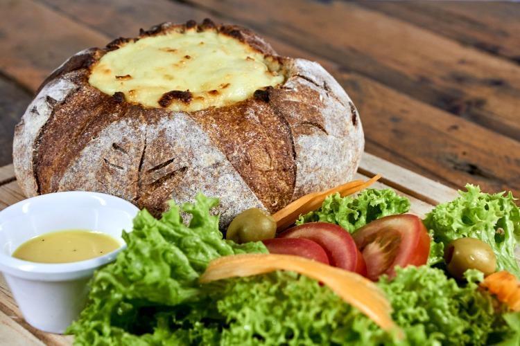 Yuvarlak tam buğday ekmeğinin üzerini kapak olacak şekilde kesin ve ekmeğin içini alın.