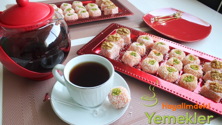 • –  Küçük dilimlere kesin servis için elimizle top şekli verip hindistan cevizine buluyoruz üzerine parmağınızla hafifçe bastırın ve üzerine toz fıstık serpin ve servis  yapıyoruz