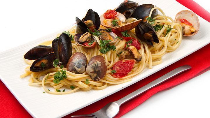 Bir tencereye 10-12 bardak su koyalım ve kaynayınca bir çay kaşığı tuz ile makarnayı haşlanmaya bırakın. Öte yandan derin bir tavaya sızma zeytinyağını koyun, sarımsak ve soğanları ekleyip 1-2 dakika kavurun. Sonra kabuklu ya da kabuksuz midyeleri ve kuru ya da taze domatesleri ekleyerek 4-5 dakika kadar soteleyip, beyaz şarabı içine aktarın. Yaklaşık 2-3 dakika sonra ocağın altını söndürün. Bu arada makarnayı 9-12 dakika kadar haşlayıp süzün. Öte yandan tavanın içinden midyeleri çıkarın. Aralarında ağzı açılmayanlar varsa onları atın. (Eğer kabuksuz midye kullandıysanız hiç tavadan dışarı çıkarmanıza gerek yok.) Sosunuzu tamamlamak üzere, krema ve zeytinyağını tavadaki sosun üzerine ekleyerek hep beraber 7-8 dakika daha kaynatın ve altını kapatın. Sonra sıcak sosun içine haşlanmış ve kabukları açılmış midyeleri tekrar ilave edin. Bir tarafta bekleyen süzülmüş makarnayı da yine midyeli sosun içine aktarın. Karıştırıp, üzerini ince kıyılmış maydanozla süsleyip, servise sunun.