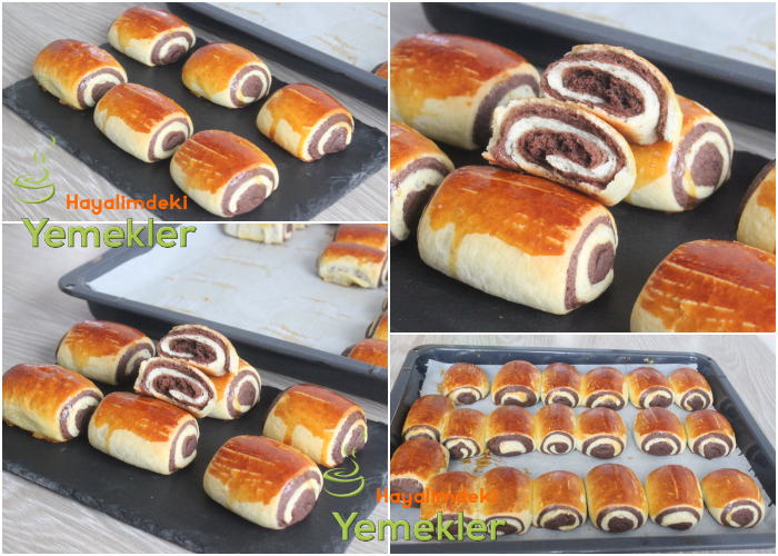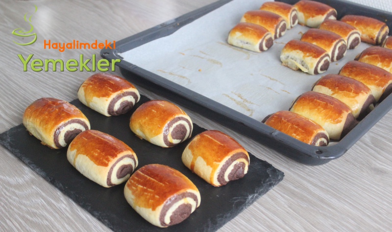 - Dinlenen hamurun önce sadesini büyük dikdörtgen olacak şekilde açın kakaolu olan hamuruda aynı boyutta açın sade olan hamurun üstüne fırça ile ıslatın kakaolu hamuru sade hamurun üzerine alın tekrar su sürün hamuru uzunlamasına 2’ye kesin düzgün bir şekile rulo yapın 5-6 cm uzunluğunda kesin aralıklı olarak yağlanmış veya yağlı kağıt serilmiş fırın tepsisine yerleştirin üzerini kapatın 30 dk dinlendirin eğer aceleniz varsa 50 °’de fırında 15-20 dk kadar bekletin,