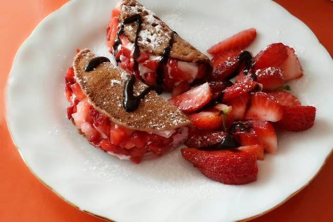 Kreplerin ortasına krem şanti koyun ve sandviç gibi ikiye katlayın. Krepin krem şantili bölümlerini mini mini doğradığınız çileklere bulayın. Üstünü çikolatalı sos ve pudra şekeri ile süsleyin.