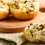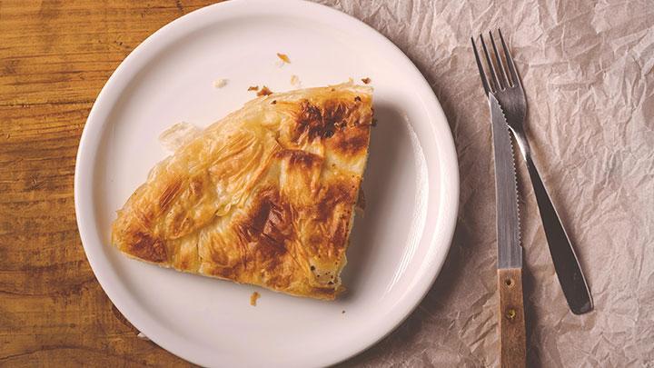 Dinlenen hamuru göz kararı ikiye ayırın. Ayırdığınız her iki parçayı da yine göz kararıyla 20’şer eşit parçaya ayırın. Yufkaları açmanıza yardımcı olması için un ve nişastayı karıştırın. Alt ve üst için 20’şer yufka, yani toplamda 40 yufka açacaksınız. Yufkaları yağlamak için de tereyağını eritin ve içine zeytinyağını ilave edip karıştırın. Her bir yufkayı yaklaşık 20 santimetre çapında olacak şekilde oklavayla açın. Yufkalar 20 adet olduktan sonra her bir yufka arasını yağlayın. En son yufka yağlanmayacaktır. 20 yufkayı aralarını yağlayıp üst üste koyduktan sonra yaklaşık 40 santimetre çapındaki bir tepsi ebadına gelene kadar tekrar oklavayla açın. Böylelikle alt katman hazır oldu.