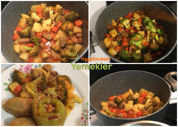 Kıyma suyunu çekip kızarmaya başlayınca salçasını pulbiberi, karabiberi ilave edin biraz kavurun üzerine iyice yıkayıp soymuş olduğunuz patatesi,Brokoliyide ilave edip biraz soteleyin göz kararı vey 2 bardağı kadar sıcak su ilave edin, O kaynamaya başladıktan sonra kısık ateşte Sebzeler yumuşayana kadar pişirin En son tuzunu birkaç dakika daha pişirin de Ocaktan alın biraz dinlendirip servis yapın ☺️