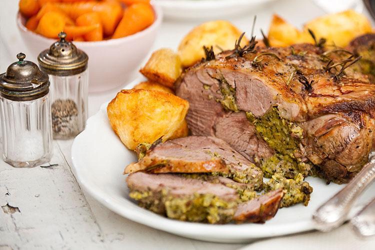 Kuzu but etinin fazla yağlarını kesip zeytinyağıyla ovun. Keskin bir bıçakla boylamasına derinin hemen altından kesikler açın. Sarımsak ve taze otlardan yerleştirin. Tuz ve karabiber serpin. Kalan taze otları etin üzerine koyup buzdolabında iki saat bekletin. Fırın tepsisinin tabanına havuç, patates, arpacık soğan ve sarımsakları yerleştirin. Eti de sebzelerin üzerine yerleştirip iki yemek kaşığı zeytinyağı gezdirin.