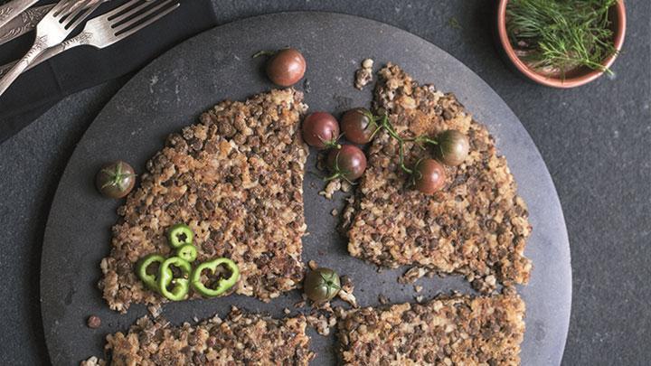 26 santimetre çapındaki bir tavayı kızdırın, 1 kaşık zeytinyağı koyun, üzerine galeta unu serpin. Mercimekli karışımı bastırarak tavaya koyun. Tek tarafı orta ateşte 6-7 dakika kadar pişirin. Çevirmek için servis tabağı, ikinci bir tava veya kesme tahtası kullanılabilir.