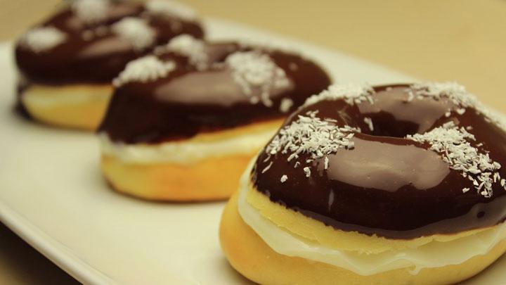 Soğuyan hamur parçalarını enine ortadan ikiye kesin ve kapaklarını bir kenara ayırın. Kremayı alt hamur parçalarının üzerine sıkın.