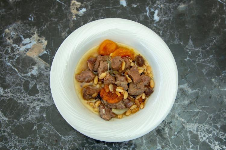 Başka bir tencerede suda haşladığınız bademler ile jülyen doğradığınız incir ve kayısıları soteleyin ve ete ekleyin.