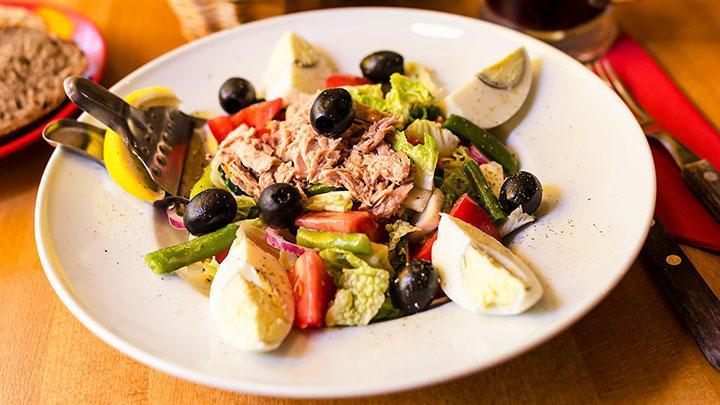Ayıklayıp ortadan ikiye böldüğünüz taze fasulyeleri derin bir tencerede yaklaşık 2 dakika kadar haşlayın. Suyunu süzdükten sonra başka bir kaptaki buzlu suya daldırıp çıkarın. Fasulye, halka soğan, dilimlenmiş domates, ton balığı, zeytin, dörde bölünmüş yumurta ve ançüezi bir kapta karıştırdıktan sonra servis tabağınıza alın. Ayrı bir yerde sarımsak, hardal, sirke ve zeytinyağından bir sos hazırlayın. Hazırladığınız bu sosu salata malzemelerinin üzerine dökün. Kızarmış ekmekle servis edebilirsiniz.