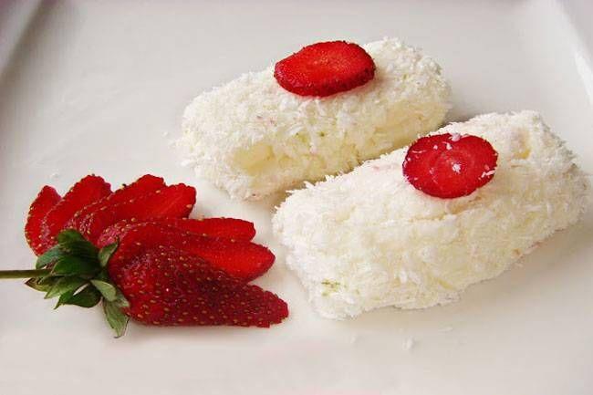 Dikdörtgen şeklinde dilimleyip, bir ucuna dövülmüş Antep fıstığı koyun. Rulo şeklinde sarın ve bolca Hindistan cevizi ile dışını kaplayın.
