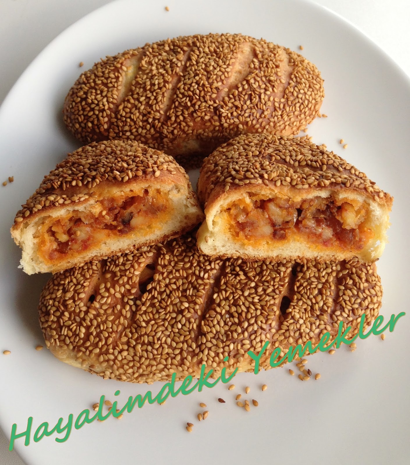 • kapattığınız poğaçayı  önce pekmezli suya sonra susama güzelce bulayıp yağlanmış tepsiye aralıklı olarak yerleştirin  tepside 45 dakika  dinlendirin ve önceden ıstılmış  180 derece fırında pişirip servis yapabilirsiniz resimli Simit Poğça nasil yapilir