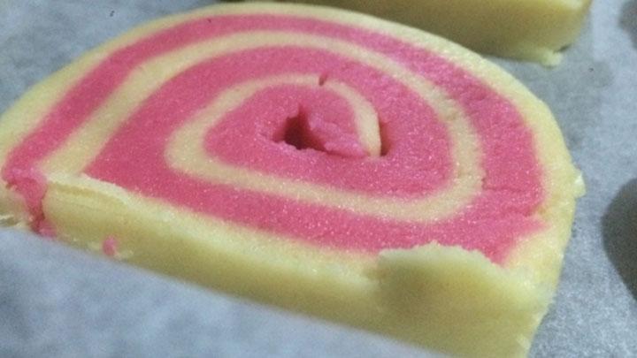 1 yemek kaşığı sütle pembe gıda boyasını karıştırın. Elde ettiğiniz karışımı hamurun yarısına yedirin. Her iki hamuru da aynı boyutta ayrı ayrı açın. Daha sonra ilkinin üzerine pembeyi koyun ve rulo yapın. Dolapta yarım saat kadar bekletin. Sonra 1 santimetre kalınlığında dilimleyin.