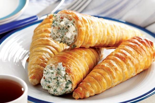Milföy hamurlarını inceltip kalın şeritler halinde kesin. Koni şeklindeki metal kalıpların etrafını yağlayıp milföy hamurlarını üzerine sarın. Üzerine yumurta sarısı sürüp önceden ısıtılmış 175 derece fırında rengi dönene kadar pişirin. İç harcı için beyaz peyniri ezip sürülebilir beyaz peynirle karıştırın. İnce ince kıydığınız dereotu, maydanoz ve kırmızı pul biberi ilave edin. Tüm malzemeyi iyice karıştırdıktan sonra soğuyan milföy hamurlarının içine doldurun. Peynir dolgulu milföy hamurlarınızı tekrar fırına verin. Peynirler hafif eriyene kadar 4-5 dakika daha pişirip sıcak servis yapın.