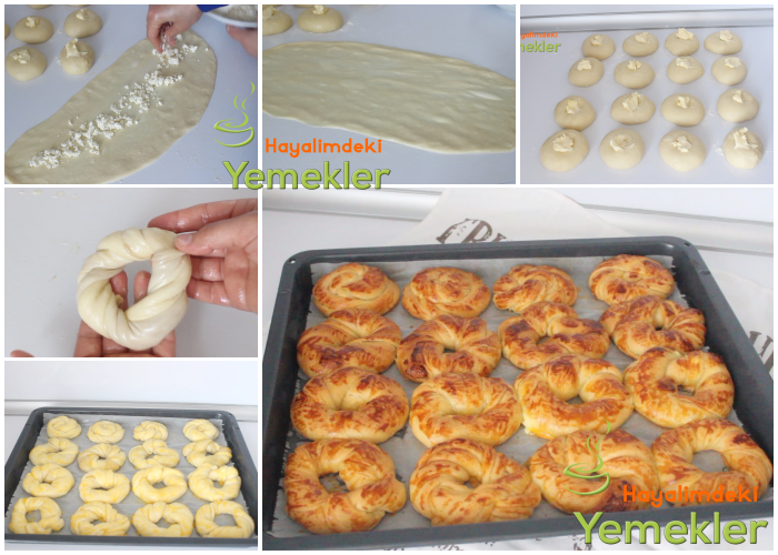 - Kabaran hamurdan yumurta büyüklüğünde bezeler yapın üzerine 1 çay kaşığı tereyağ koyun ve elinize açın üzerine peynir serpiştirin rulo yapın.yuvarlak bir şekil verin