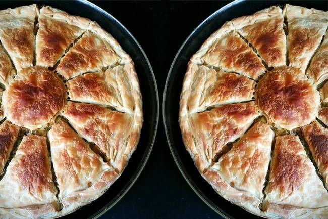 İç malzemesini hazırlamak için pırasanın dış kabuklarını temizleyin ve yıkayın. Pırasayı ince kıyım doğrayın. Bir tencereye zeytinyağını alın ve pırasayı ekleyip rengi dönene kadar kavurun, baharatlarla tatlandırıp soğumaya bırakın. Tepsiyi tereyağı ile yağlayın. Bezelerden birini alın ve tepsinin içinde elinizle çekip tepsiye yerleştirin. (Oklava veya merdane ile açmayın.) Hamuru tepsinin kenarlarına kadar yükseltin. İç malzemeyi üzerine yayın. Diğer bezeyi de biraz tezgahta büyütün ve iç malzemenin üzerine yerleştirin. Yan duvarlardaki hamuru kenarlardan üzerine bastırın. Böreği yuvarlak bir tepside yapıyorsanız tam ortasına yuvarlak bir tabak kapatıp etrafından kesin. Ortadaki yuvarlağı merkez alıp havuç dilimi şeklinde kesin. Üzerine zeytinyağı sürün. Önceden ısıtılmış fırında kızarıncaya kadar pişirin.