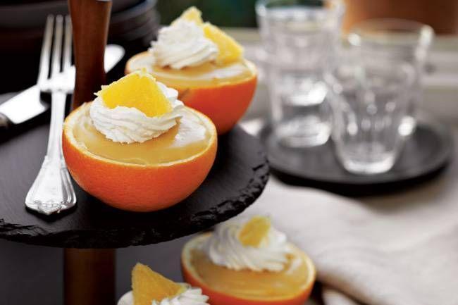 Portakal kreması için gerekli olan tüm malzemeyi orta boy bir sos tenceresine alın. Koyu bir kıvam alana kadar sürekli karıştırarak pişirin. Ocaktan alıp ılınmaya bırakın. Portakalları ortadan ikiye kesip içlerini çıkartın. Kabukların içine portakal kremasından koyup buzdolabında en az 2 saat bekletin.