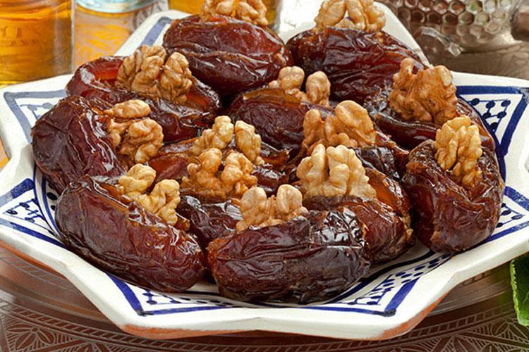 Ertesi gün yumuşayan meyveleri enine yarıya kadar kesin. Hurmaların çekirdeklerini çıkarın. İçlerine yarım cevizleri doldurun ve servis tabağına bir kayısı, bir incir, bir hurma şeklinde dizin. Üzerine ince dövülmüş fıstık serpebilirsiniz.