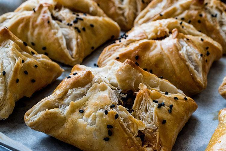Tüm malzemeyi bu şekilde hazırladıktan sonra milföylerin üzerine çırpılmış yumurta sürün ve çörekotu serpin.