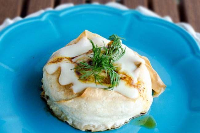 Göğüs etini iyice yıkadıktan sonra üzerini geçecek kadar su koyup limon suyunu ve tuzunu ekledikten sonra pişirin. Pişen ve soğuyan eti didikleyin. Üzerine biraz tuz ve karabiber ekip harmanlayın. Yufkaları açın ve dört eşit parçaya bölün. Her birine fırça ile sıvı yağ sürün. Geniş tarafına tavuk etini yayın ve rulo yapıp daire şekli verin. Bütün yufkaları bu şekilde bitirin. Önceden ısıttığınız 200 derecelik fırında kızarana kadar pişirin. Ardından fırından çıkarın üzerine 2 su bardağı tavuk suyunu dökün tekrar fırına verin. 20 dakika beklettikten sonra çıkarın.