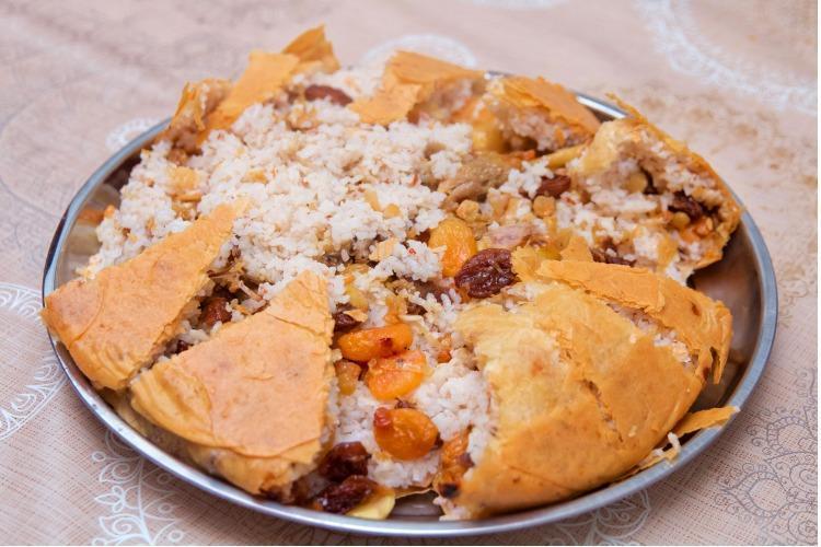 Eti ve meyvelerin bir kısmını da pilavın ortasına yerleştirin.