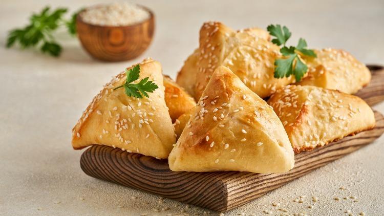 Hamurun kenarlarını yukarı doğru büzüp üçgen şeklinde kapatın. Üzerlerine yumurta sarısı sürdükten sonra önceden ısıttığınız 175 derece fırında pişirin.