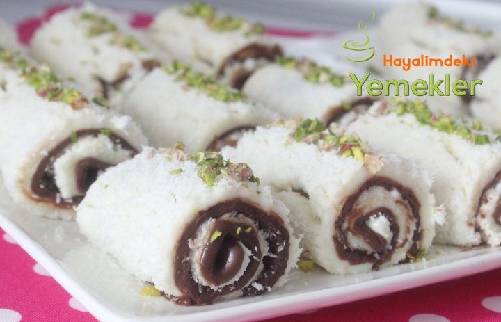 - İsteğe göre çikolata sosu yerine kremşanti de kullanabilirsiniz . Üzerine hindistancevizi buzdolabında Soğuyana kadar (1,5 saat ) dinlendirin ister rulo yaparak isterseniz ikiye  katlayarak servis yapın.