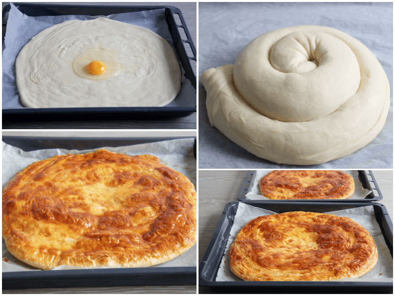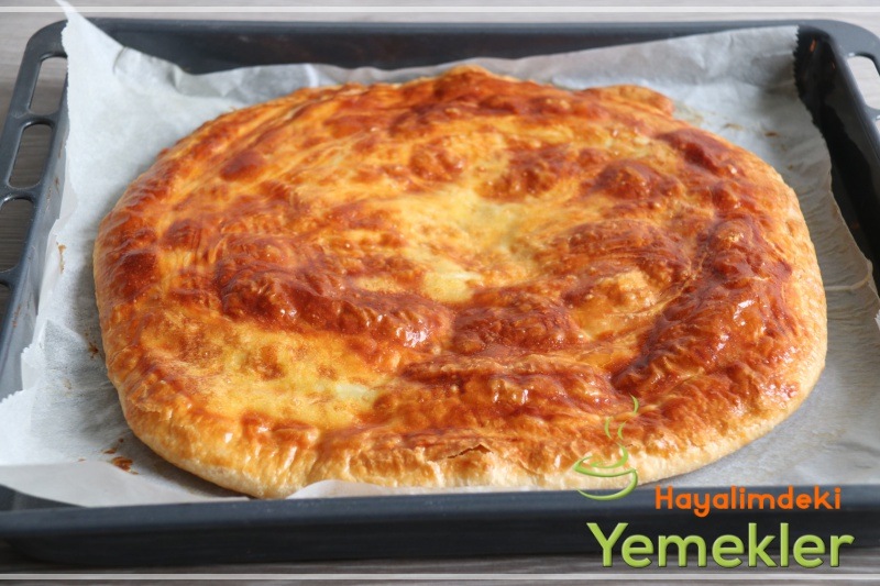 Dinlenen hamuru tepsinin boyutunda önce elinizle sonra merdaneyle açın üzerine bir adet yumurtayı sürün önceden ısıtılmış 190-200° fırında alt üst ayarda pişirin. - Ve birazcık dinlendirdikten sonra servis yapabilirsiniz afiyet olsun
