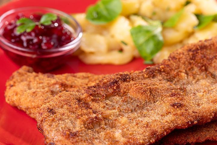 Şinitzelleri patates salatası, otlu tereyağı, kızılcık sosu ve bir dilim limon ile servis edebilirsiniz. Afiyet olsun…