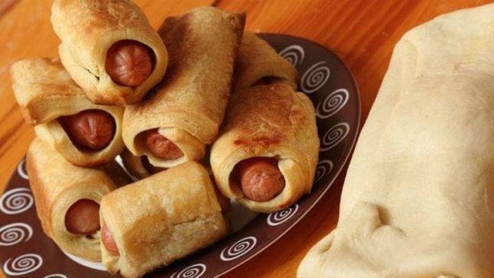 Milföy hamurlarını dolaptan çıkarın, tek tek ayırarak yumuşamasını bekleyin. Yumuşamış olan hamurun üzerine sosisleri koyun. Milföy hamurunu sosislerin uçları açık kalacak şekilde görseldeki gibi enine sarın. Hamurların üzerine azar azar yağ sürün. En üst kısmına ise yumurta sarısı sürün. 180 derece önceden ısıtılmış fırında pişirin.