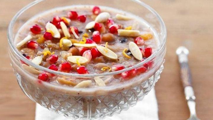Ardından kuru kayısı, ceviz, dolmalık fıstık ve kuş üzümü ile süsleyerek servis yapın.