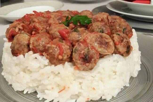 Köfte malzemelerini yoğurduktan sonra ufak ufak yuvarlayın ve az sıvı yağda kızartın. Bir tavaya rendelenmiş bir adet domates ya da domates sosu koyup köfteleri domates sosunun içinde döndürün ve yuvarlak bir kasenin içine yerleştirin. Üzerine demlenen pilavı koyup düz bir tabağa ters çevrilerek servis edilir.