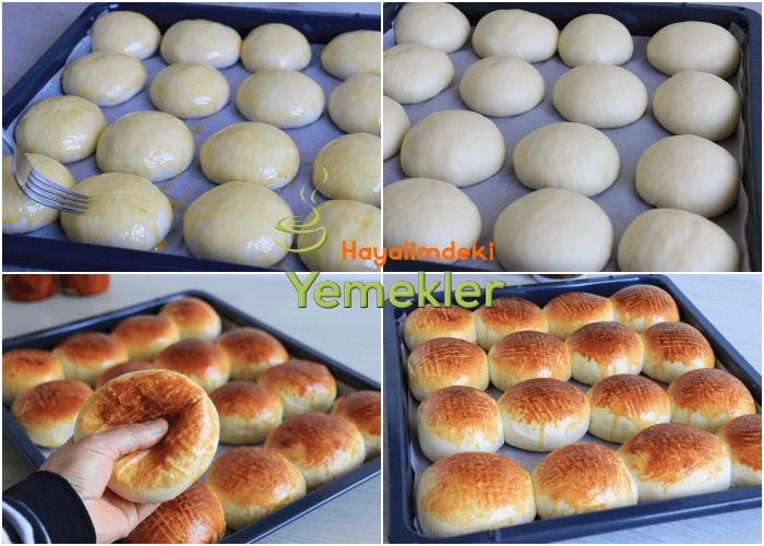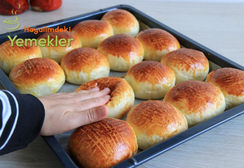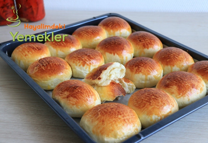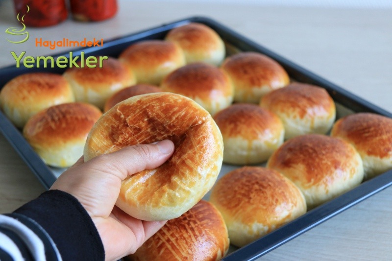 • Hamurumuzu yumurtadan büyük bezeler yapın,bezeleri elinizle yuvarlayıp beyaz peynir yerleştirip kapatın yuvarlak şekil verin, yağlı kağıt serilmiş fırın tepsisine aralıklı olarak yerleştirin Üzerine temiz bir bez örtüp 45 dakika kadar dinlendirin.