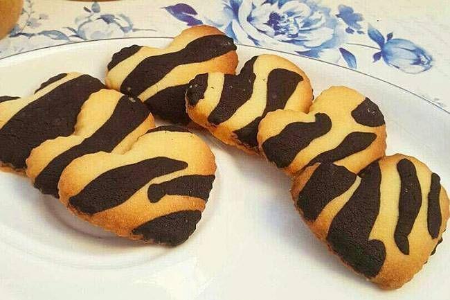 Hamuru 3 parçaya ayırın. Hamurun bir parçasına kakao ilave edin, diğer iki parçayı birleştirip merdane ile hafif kalın olacak şekilde açın. Kakaolu parçalardan elinizle küçük parçalar koparıp uzatın. Bu uzun parçaları birbirlerine paralel olacak şekilde, açtığınız sade hamurun üzerine koyun. Koyduğunuz parçaları elinizle biraz bastırdıktan sonra birleştirdiğiniz hamurları merdane ile açın. Kalıpla kestiğiniz kurabiyeleri fırın tepsisine dizin.